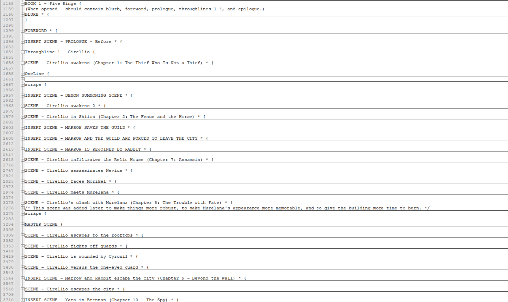 Expanding a scene shows me the individual scene. I can also shoehorn other goodies in there, such as “scraps” (stuff I wrote for the scene but didn’t use), notes (such as notes about how I expect the scene to go, how the scenery might look, etc.), brainstorming sessions (such as a Q&A with myself about the scene), hanging questions about the scene (what I don’t yet know, but hope to figure out through discovery writing), concerns I may have about the scene both before and after I write it, etc.