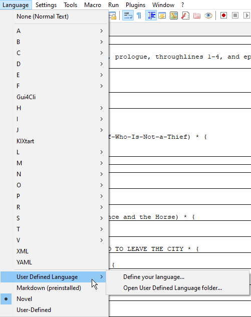 I even created my own custom language called “Novel”. Notepad++ makes this very easy to do, but it’s an optional step.