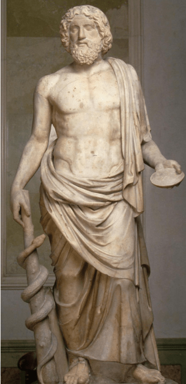 The god Asclepius (Asklepios) seemed to exist before written word existed, and was mentioned in Homer’s The Illiad. During the Trojan War, Paris wounded Menaleus with an arrow. It was one of Asclepius’ two sons, both heroes of the war, who removed the arrow and applied the healing salve which allowed Menaleus to recover.