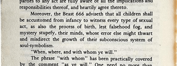 Okay, so you’re still with me. Understand that each child who is brought up within the order is raised by members of the O.T.O. who call themselves “doctor-priests”. They teach children “from the earliest age” that “sex organs are holy”.