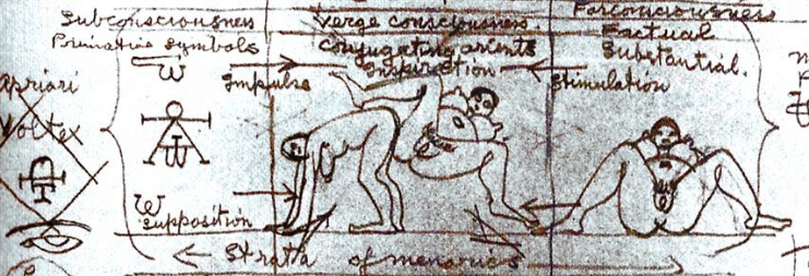 I won’t go any further on what they get up to during “mass” with their “magick rods”, aside from leaving you with a few crude drawings of Crowleyan sex Magick: