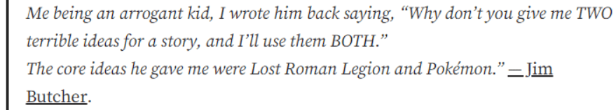 What’s worse, instead of ideas, the rando actually gave him two highly interesting and robust subjects: The Lost Roman Legion and Pokémon.