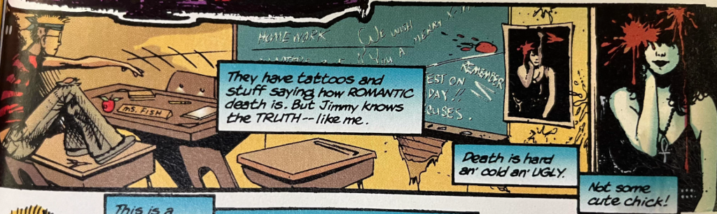 Feel free to laugh … or take her seriously; 1989 was a much different time. I’ve spoken about ankh symbolism in the past, and Sam Kieth already did a sufficient job ribbing this take on the famous goth psychopomp in his own comic, The Maxx: