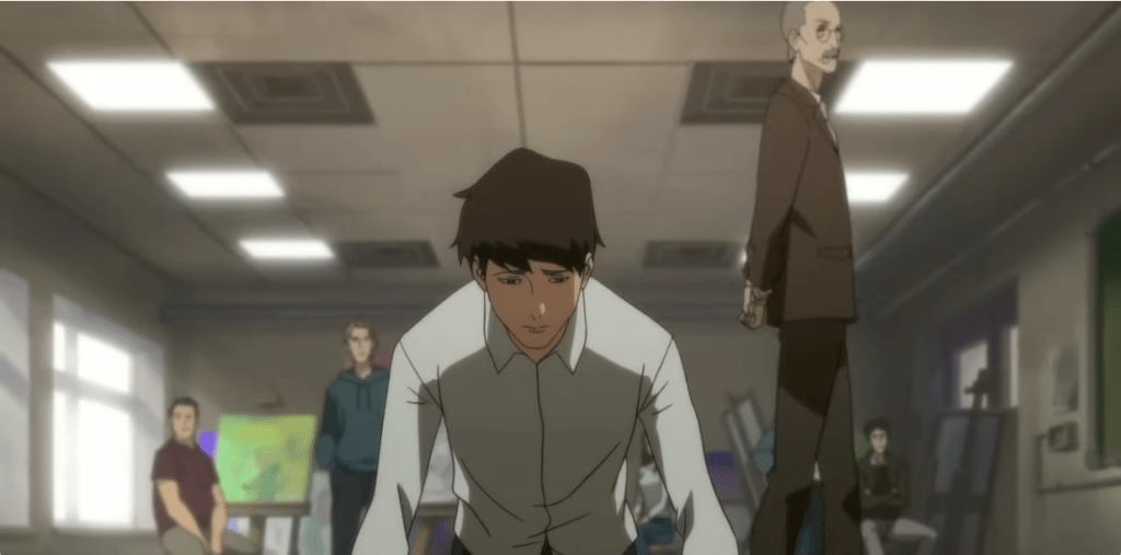 Then he flashes back to art school where his teacher goes so far as to trample his artwork, saying he doesn’t have enough talent to succeed in the art world.