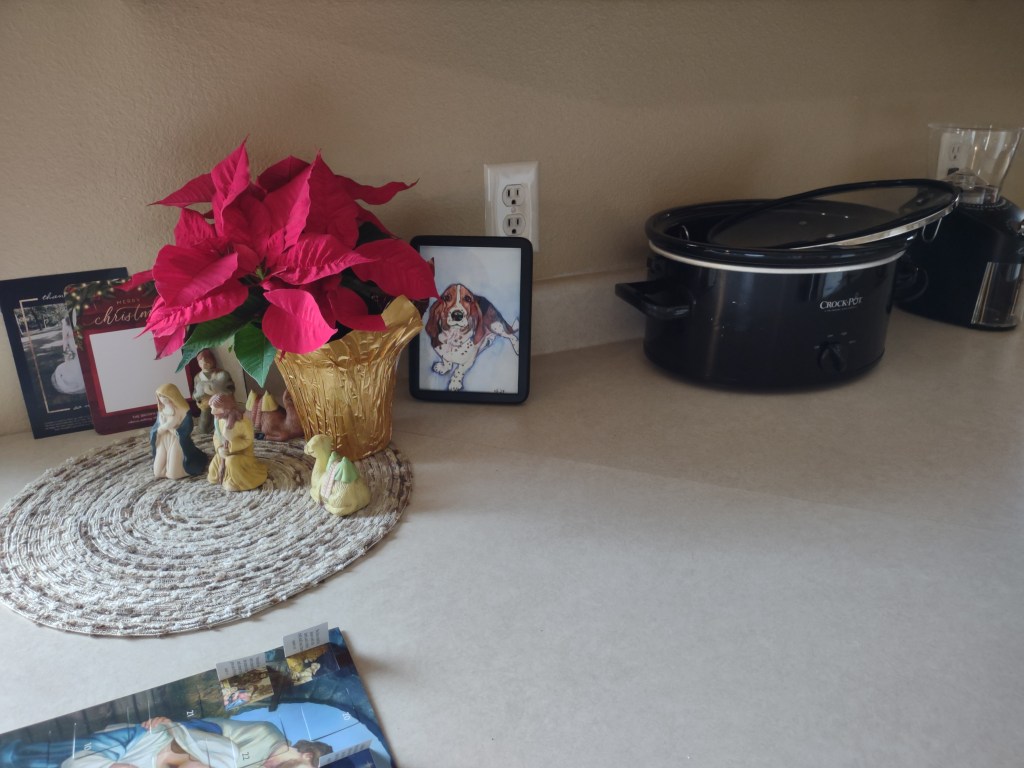 It’s definitely still Christmas around here, but this pic was taken earlier in December (as evidenced by the advent calendar having barely been broken in). Surrounding a watercolor of our dearly departed basset hound is a nativity, poinsettias, a crock pot, and some early Christmas cards.