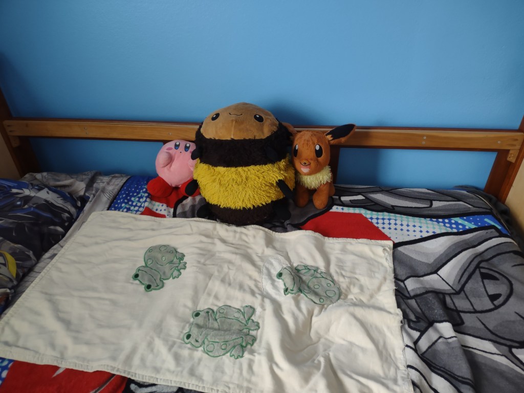 In fact, everybody in the house likes stuffed animals to some extent. This was not staged – it’s exactly as my other son had left his bed. His “froggie blanket”, as he calls it, has been with him since the NICU. It’s seen many repairs over the years, but it’s still hanging out.