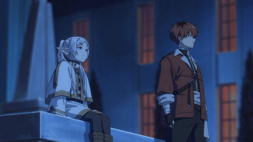 And so, Frieren waits outside. And Stark offers to wait with her, like a true gentleman. Hours pass, and night falls.