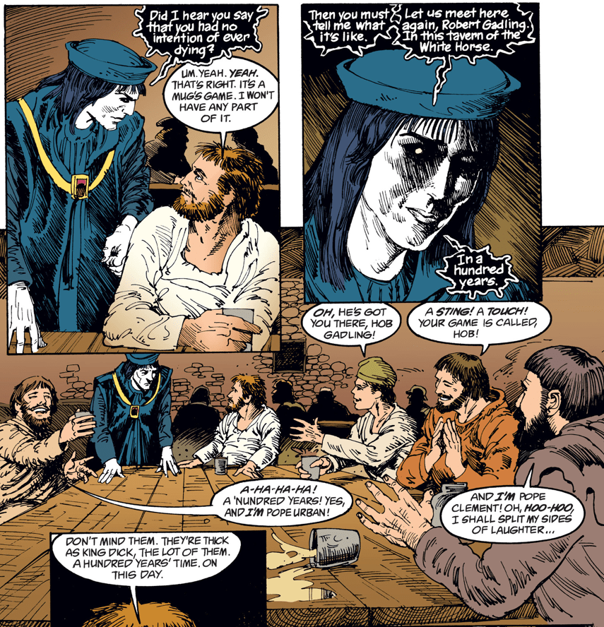 But the story proper is set 601 years earlier in the Year of Our Lord, 1389, where Dream and Death of the Endless are sharing an interesting discussion in the Tavern of the White Horse.