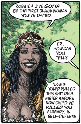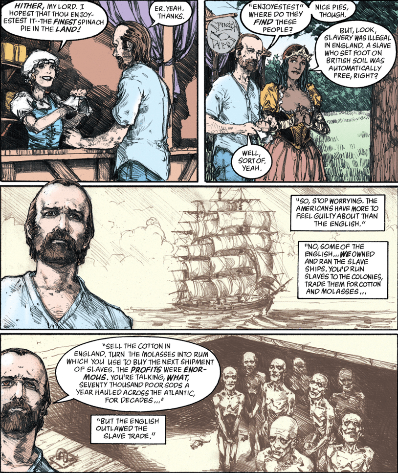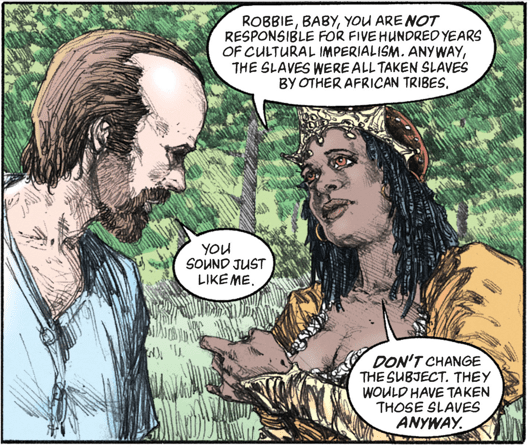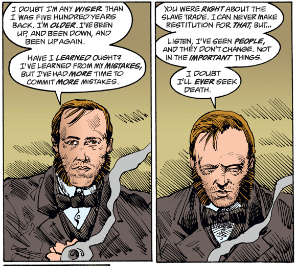 Hob’s doing okay, but he’s realizing infinite time on Earth doesn’t necessarily help you get over your vices. What’s more, he’s feeling White Guilt, proselytizing that no amount of Reparations can ever make up for what he did to the slaves.